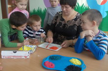Зурлар катнаш төркеме балалары тәрбияче Асылгариева Альбина Альфред кызы белән иҗади эш белән шөгыльләнергә тозны гуашь белән буяп рәсемләү өчен материал ясап куйдылар.