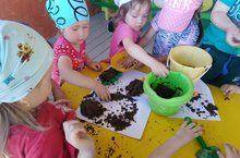 Уртанчылар һәм зурлар катнаш төркеменә йөрүче балалар тәрбияче белән берлектә, саф һавада ком һәм су белән тәҗрибәләр үткәрделәр. Ком һәм аның үзлекләре турында белемнәрен камилләштерделәр, тәҗрибәләр үткәргәндә сак эш итә һәм нәтиҗәләр ясый белү күнекмәләрен ныгыттылар. “Коры комнан рәсем”, “Юеш комнан рәсем ясадылар.