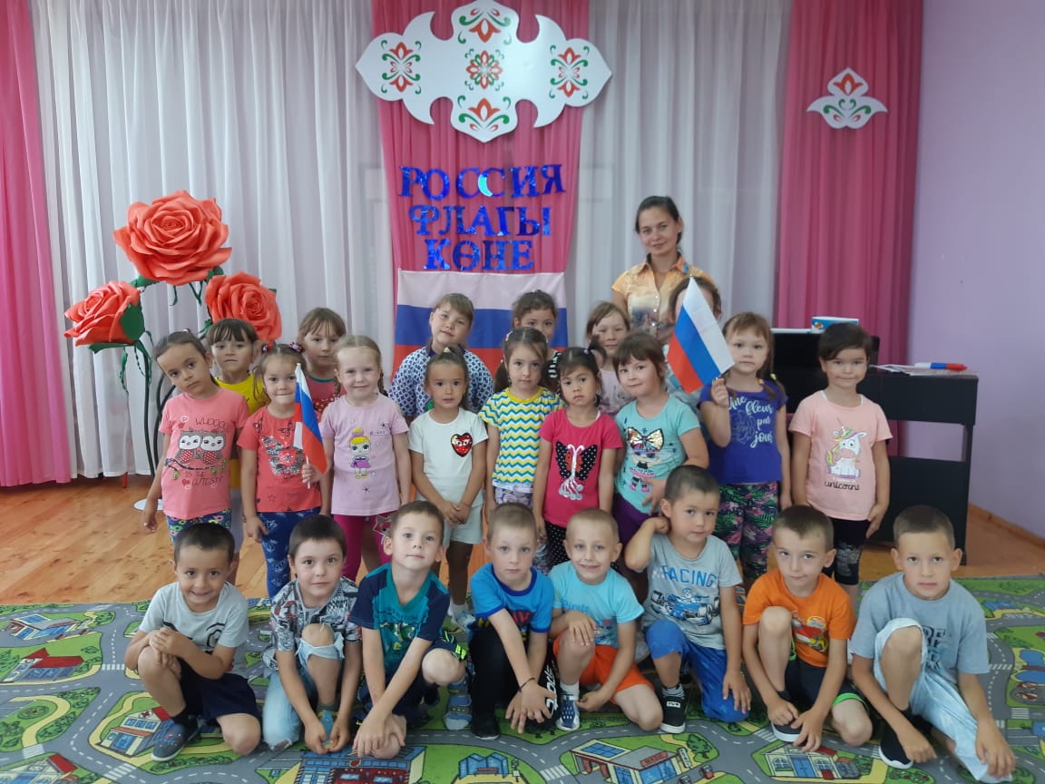 Бүген – 22 август - Россия флагы көне. Россия флагының өч төсе - Ватаныбызның иң мөһим символларының берсе. Ак төс азатлык һәм мөстәкыйльлек, зәңгәр - ышаныч һәм рухият, кызыл бөеклек һәм көч-куәт дигәнне аңлата. балалар Бәйрәмне балалар белән бик мавыктыргыч итеп спорт ярышы формасында үткәрдек. Балалар ике командага бүленеп бер – берсе белән көч сынаштылар. “Тату комада”, “Игътибарлы бул”, “Тупны җибәр”уеннарында балалар үзләренең тизлекләрен, бердәм булуларын күрсәттеләр. Ә “Флагны төзе” уенында ике команданың командиры да бик җитез һәм бик дөрес итеп флагларны җыеп куйдылар. Балалар әлеге чарада Россия флагы, гербы һәм гимны турындагы белемнәрен тагын бер кат искә төшереп, яңа белемнәр алдылар.