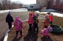 Воспитанники первой младшей группы на прогулке наблюдали за грузовой машиной, который привез товар в детский сад.