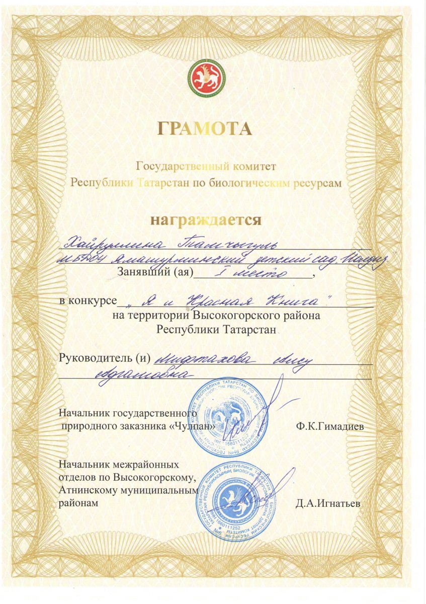 Хайруллина Тамчыгөл Р. "Кызыл китап "конкурсында катнашышып грамота ( 1нче урын) белән бүләкләнде./Хайруллина Тамчыгуль Р. награждена грамотой за 1 ое место в конкурсе "Красная книга"