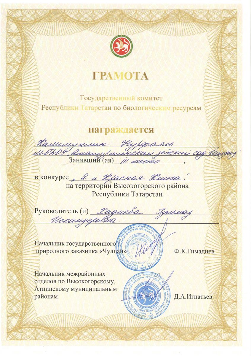 Калимуллин Нурфаэль Р. "Кызыл китап "конкурсында катнашышып грамота ( 3нче урын) белән бүләкләнде /Калимуллин Нурфаэль Р. награжден грамотой за 3 е место в конкурсе "Красная книга"