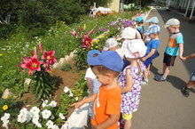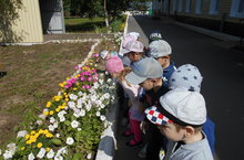Август. Роскошный период лета, который радует нас обильным урожаем овощей, фруктов, грибов и ягод, а также благоуханием цветов – бархатцев, петуньи, астр, гладиолусов… Сегодня с детьми средней группы МБДОУ «Берёзка» была проведена экскурсия на тему «Цветники в детском саду» с целью обобщения знаний детей о цветах и растениях летом. Ребята построились за воспитателем «паровозиком» и отправились в путешествие. Остановками стали клумбы с розами, бархатцами, петуньей, ромашками. Ребята называли цвет и названия растений, их строение, а также вспомнили о правилах, которые запрещают срывать, ломать, топтать цветы на клумбах. Цветы порадовали детей своей красотой и изобилием на клумбах.