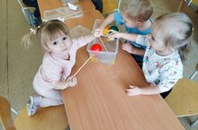 Сегодня малыши первой младшей группы играли с водой , знакомились в игровой форме со свойствами предметов тонет- не тонет . -