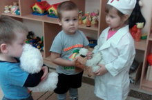 Бүген 1 “В” кече төркемендә табиб һәм балаларның сәламәтлекләре темасына багышланган әңгәмә үткәрелде. Аннары “Доктор Айболит”сюжетлы-рольле уены оештырылды. Табиб янына дәваланыр өчен төрле уенчык хайваннар һәм курчаклар килделәр. Балаларга бу уен бик тә ошады, аеруча ак халат һәм ак башлык.