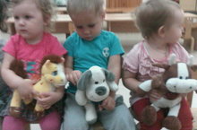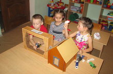 Бүген 1 кече “В” төркемендә балалар “Йорт хайваннары” исемле уен уйнадылар. Уйнаган вакытта сабыйлар йорт һәм ферма хайваннары белән таныштылар: сыер, ат, бәрән, кәҗә. Шулай ук хайваннарның тавышларын тыңладылар һәм кабатлап карадылар. Тәрбияче балаларга йорт хайваннары турында шигырь укыды, уеннар уйнады.
