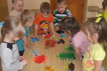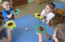 Воспитанники решили создать композицию «Весенняя полянка», на которой разместили солнышко, бабочек, забавных ежей и гусениц, а так же разноцветные цветочки.