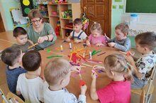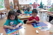 Роспись игрушки из дерева - это исконно русское занятие, которое своими корнями уходит в древность. Рассказав детям об истории новогодней игрушки, Надежда Егорова предложила своим воспитанникам старшей " А" группы выбрать деревянные фигурки и цвета по душе для своей творческой деятельности. Внимательно рассмотрев их, аккуратно и неторопливо детские ручонки создавали свои маленькие, но уникальные шедевры: снежинки, елочки, сапожки, домики, шарики, ангелочки. В завершении мы украсили группу, дополнив оформление сказочной новогодней атмосферы, своими расписанными деревянными изделиями. Дети в восторге! Какая красота!