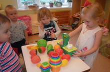 Сегодня на занятии воспитатель Наталья Гаврилова сообщила ребятам, что открылся новый магазин, где продаются овощи и фрукты, и предложила им отправиться туда.