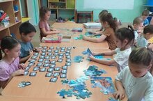 Пазлы — увлекательное и интересное занятие для детей. Самостоятельные игры при помощи пазлов развивают пространственное и абстрактное мышления. Таким образом, у ребенка развивается фантазия, когда он способен придумывать что-то или представлять то, чего в данный момент отсутствует перед ним. Дети подготовительной группы «Колобок» очень любят собирать пазлы, их они раскладывают не только за столом, но и на ковре. Иногда дети даже соревнуются между собой – кто быстрее соберет. Все очень стараются, в процессе выкладывания деталей ребята очень внимательны и крайне сосредоточены. Как всегда побеждает дружба. Этой игрой увлекаются и девочки, и мальчики. Подобные мероприятия способствуют развитию личностных особенностей детей, расширяют знания дошкольников об окружающей действительности, формируют логическое мышление, умение рассуждать, доводить начатое дело до конца.