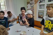 Работники центра рассказали ребятам о истории создания швейной машинки. Затем дети пришивали пуговицы. Те дети, кто пришили пуговицы правильно и аккуратно делали жужалки.