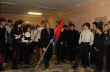 Учебный день 17 октября в гимназии начался весьма необычно. Под бой барабанов с флагом Верхнеуслонского района через всю линейку прошествовала колонна агитбригады.