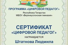 Рейтинг нәтиҗәләре буенча гыйнвар ае өчен бонус программасының «Санлы педагог» статусы гимназиянең физика һәм информатика укытучысы Штатнова Л.Е. бирелде.