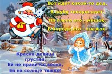 В каждом доме много светаНаступает Новый год!Белоснежная каретаДед Мороза привезет.Ровно в полночь вспыхнут яркоВ небесах гирлянды звезд.Не приходит без подарковВ этот праздник Дед Мороз! -