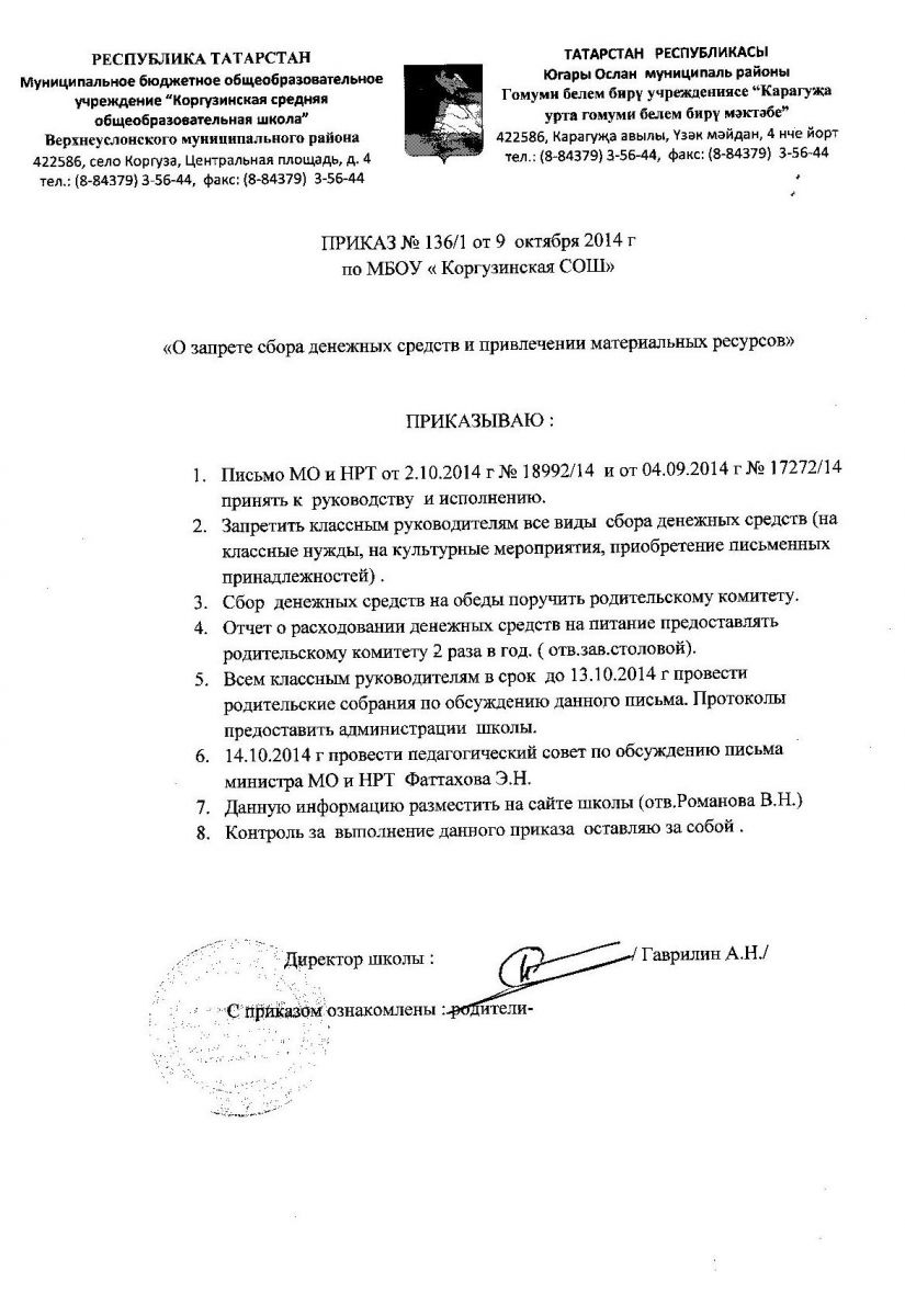 Приказ №136/1 от 09.10.2014 "О запрете сбора денежных средств и привлечение материальных ресурсов