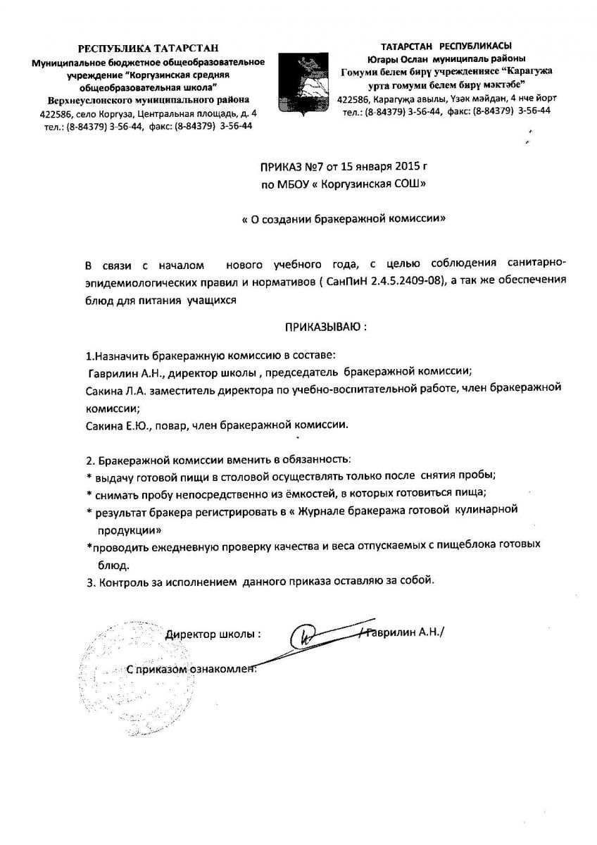 Приказ №7 от 15.01.2015 "О создании бракеражной комиссии