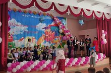Школа организовала целое представление - сначала директор и почетные гости поздравили всех с новым учебным годом, в гостях побывали Незнайка и Дед Мороз, звучали стихи и песни, малыши станцевали веселый танец.