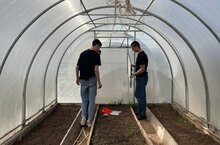 После суровой зимы одна из теплиц оказалась поврежденной ветром и большим количеством снега. Перед высадкой томатов и перцев необходимо провести ремонтные работы. Мальчики 9 класса отремонтировали форточки и дверь.