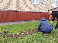 После холодных выходных погода радует солнечным днем. Сотрудники детского сада вышли, чтобы посадить цветы - ирисы.