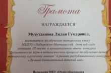 В номинации "Лучшая дидактическая игра " заняла 3 место по району , воспитатель по изучению татрского языка "Набережно-Морквашского детского сада" Мухутдинова Л.Г.