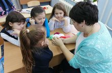 Яр буе Морквашы гомуми белем бирү мәктәбе китапханәчесе Прохорова И.Р. 1 нче сыйныф укучылары белән бергә «ТАССР логотибы төшерелгән иң -