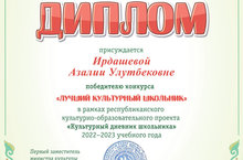 Ученица 4 класса МБОУ «Октябрьская СОШ» Ирадашева Азалия победителем муниципального этапа Республиканского культурно-образовательного проекта «Культурный дневник школьника» за 2022-2023 учебный год.