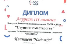 В Республиканском конкурсе «Ступени к мастерству» в рамках республиканского конкурса детского творчества «100//лица» приняли участие Квинтет «Надежда» и оркестр баянистов - аккордеонистов.