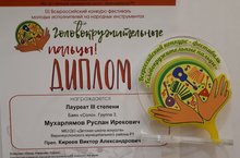 В субботу 7 декабря в г. Зеленодольске на базе ДМШ состоялся III Всероссийский конкурс-фестиваль молодых исполнителей на народных инструментах «Головокружительные пальцы», где ученик нашей ДШИ Мухарлямов Руслан (класс преподавателя Киреева В.А.) удостоился звание лауреата, заняв почетное III место в категории «Баян «Соло» 3 категория от 13-15 лет.