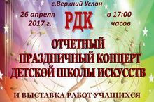 Приглашаем всех в зал РДК 26 апреля 2017 года в 17.00 на ОТЧЕТНЫЙ ПРАЗДНИЧНЫЙ КОНЦЕРТ, а также на выставку работ учащихся Детской школы искусств.