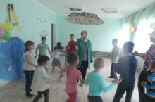 Также в лесу дети повстречали ежика, белку и зайчика. Ребята помогли белочке собрать шишки в корзину, а с зайчиком исполнили танец «Зайка прыгал, прыгал…». Вместе со сказочными персонажами дети водили хоровод вокруг березки.