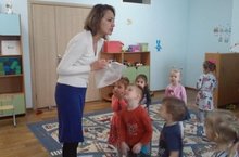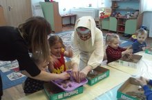 Во второй младшей группе прошло занятие по ознакомлению с окружающим миром на тему: "Свойство песка". Цель данного занятия: Вовлечение детей в элементарную исследовательскую деятельность по изучению качеств и свойств песка. На занятие к детям пришёл пёс Барбос, который и предложил отправиться детям в "песочную страну". Ребята изучали свойства сухого песка, смешивали с водой, лепили пирожки для друзей Барбоса. В конце занятия сказочный герой подарил детям радужный песок. И ребята совместно с воспитателем занялись раскрашиванием цветным песком. Ребята ещё долго делились впечатлением о путешествии в песочную страну