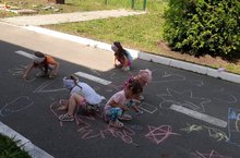 Сегодня, воспитанники старшей группы своими рисунками цветными мелками, превратили серую асфальтную площадку в летнюю яркую полянку, наполненную солнечным светом! Рисование мелом на асфальте развивает воображение, внимание,
