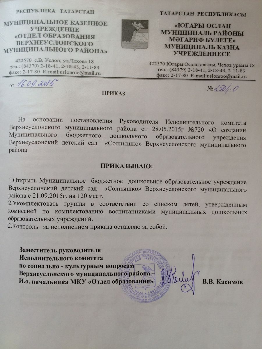Приказ об открытии МБДОУ Верхнеуслонский детский сад "Солнышко"