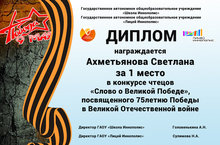 Мы объявляем конкурс чтецов «Слово о Великой Победе», посвящённого празднованию 75-летия Победы в Великой Отечественной войне! Для участия в конкурсе необходимо отправить видеоролик, где участники исполняют поэтические и прозаические произведения, посвященные теме Великой Отечественной войны на русском или татарском языках.