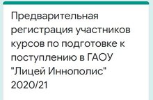 ГАОУ "Лицей Иннополис" объявляет набор учащихся 6 классов на подготовительные курсы для поступления в лицей по предметам: математика, русский язык. Начало обучения с 3 октября 2020 года (каждая суббота с 14.30-17.05). Стоимость 3000 рублей в месяц. Предварительную регистрацию можно пройти по ссылке:goo.gl/zUKYfd