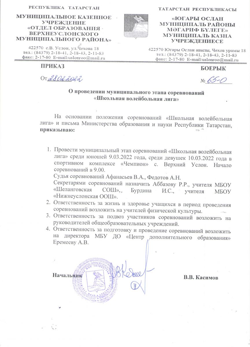 Приказ о проведении муниципального этапа соревнований "Школьная волейбольная лига"