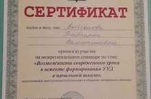 Учитель МБОУ «Печищинская ООШ» Антонова Т. В. приняла участие в межрегиональном семинаре «Возможности современного урока в аспекте формирования УУД в начальной школе», который проходил 25 ноября в лицее-интернате (школе одаренных детей) города Буинска.