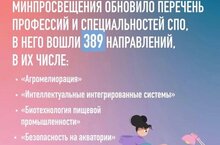 Минпросвещения утверждён новый перечень профессий и специальностей среднего профессионального образования: какие направления в него вошли и что изменилось?✅ Развитие технологий практически во всех сферах, безусловно, отражаются и на подходах в образовании. Минпросвещения России ведëт системную работу по изменению структуры и содержания программ среднего профессионального образования.В перечень вошли:???? 389 профессий и специальностей,???? в том числе 12 новых.✅ Большая часть профессий укрупнены по принципу расширения квалификаций.???? Из нового перечня были исключены невостребованные рынком труда профессии и специальности.«Новый перечень включает широкий набор квалификаций и даëт студентам право выбора образовательной траектории, исходя из конкретной ситуации на рынке труда, а у колледжей появляется больше свободы для оперативного реагирования на вызовы, связанные с изменениями в отраслях», – сказал министр просвещения Сергей Кравцов. -