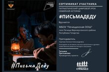 МБОУ «Печищинская ООШ» 13 января в рамках федерального проекта «Патриотическое воспитание» приняла участие в патриотическом цифровом уроке семейной истории #письмадеду, был просмотрен одноименный короткометражный фильм. В фильм вошли письменные работы школьников из нескольких регионов России, собранные в ходе межрегиональной патриотической акции «Письмо деду». Сюжет погружает современного школьника в историю подвига,который совершил в таком же юном возрасте его дедушка. МБОУ «Печищинская ООШ» получила сертификат участника