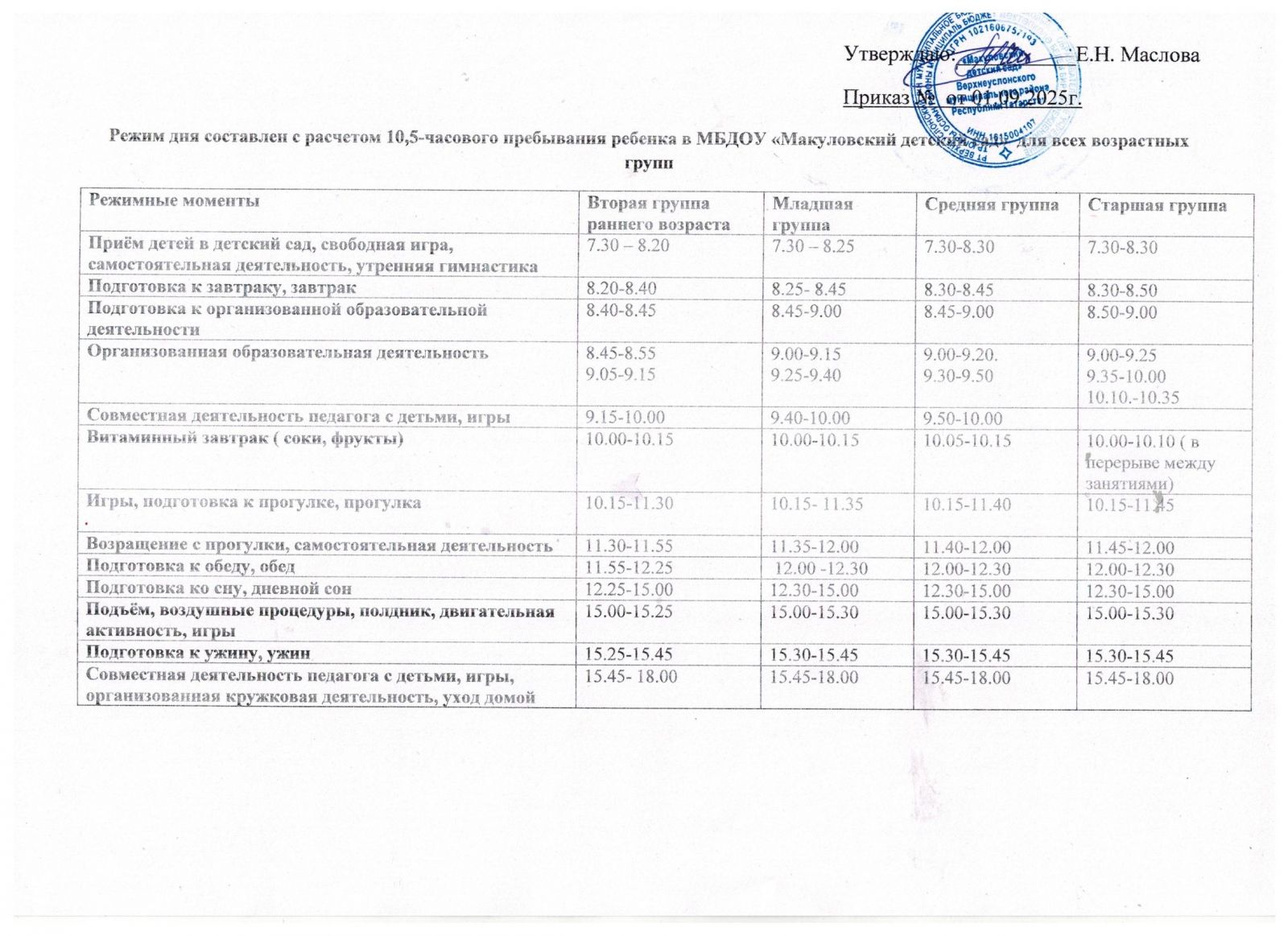 Режим дня с расчетом 10,5 часового пребывания ребенка для всх возрастных групп