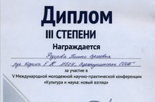 17 мая на базе Института филологии и межкультурной коммуникации им. Льва Толстого прошла V Международная молодежная научно-практическая конференция «Культура и наука: новый взгляд», где ученица 10 класса Фёдорова Полина (руководитель: Козина Е. Н., учитель английского языка) с исследовательской работой «Контрастивное описание лексических единиц по теме «Семья» в русском языке на фоне английского языка» получила диплом III степени.