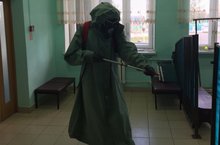 В МБОУ "Верхнеуслонская СОШ" провели дезинфекцию внутри здания. Рабочий по обслуживанию в специальном защитном костюме, предаставленном Пожарной частью Верхнего Услона, обработал стены и полы специальным дезинфицирующим раствором. В здании школы в это время никого не было.