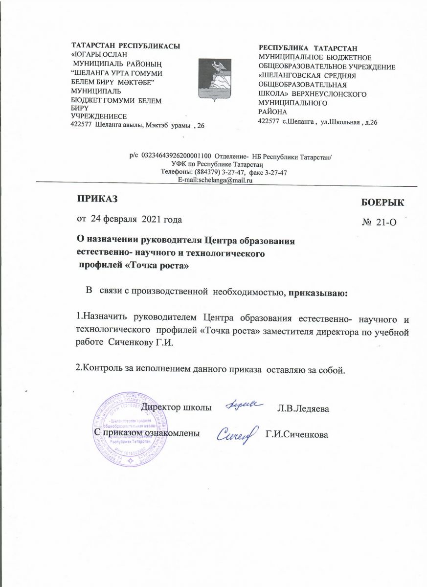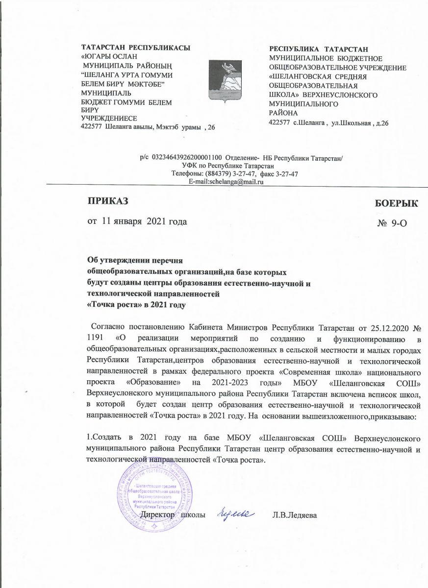 Приказ МОиН РТ "Об утверждении перечня общеобразовательных организаций, на базе которых будут созданы центры образования естественно-научной и технологической направленностей «Точка роста» в 2021 году"о Точке роста 2021