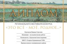 Ученица 11 класса МБОУ «Татарско-Бурнашевская СОШ» Куртымова Варвара со своим руководителем Е.А. Куртымовой приняли участие в Региональном фестивале-конкурсе «Это все – мое, родное…», в рамках реализации Международного инновационного проекта «Моя отчизна».