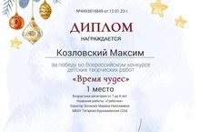 Учащиеся 2 класса МБОУ «Татарско-Бурнашевская СОШ» приняли активное участие во Всероссийском творческом конкурсе «Время чудес», представив на суд жюри поделки и были награждены дипломами: Гиниятуллин Азамат -дипломом 1 место, Козловский Максим- дипломом 1 место, Тюлькин Арсений- дипломом 1 место, Иванова Анастасия- дипломом 1 место, а руководитель Бочкова Марина Николаевна благодарственным письмом.