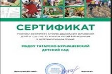 По результатам независимой оценки качества дошкольного образования МБДОУ «Татарско-Бурнашевский детский сад» получил сертификат участника Мониторинга качества дошкольного образования детей от 3 до 7 лет в субъектах Российской Федерации в экспериментальном режиме.