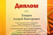 Педагог дополнительного образования ЦДО ДО «Центр дополнительного образования» Андрей Токарев со своим воспитанником, Русланом Зариповым, приняли участие во Всероссийском творческом конкурсе для детей и взрослых «День защитника Отечества». Руслан под руководством педагога изучил конструкцию военного самолета ЛА-5 и представил на суд жюри макет этого самолета. По итогам конкурса Руслан награжден Дипломом лауреата II степени. Андрей Викторович награжден Дипломом за профессионализм и подготовку победителя Всероссийского творческого конкурса «День защитника Отечества».
