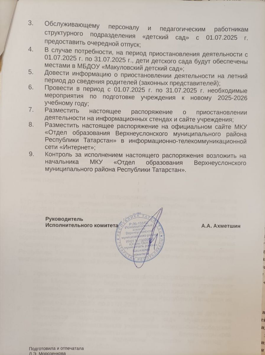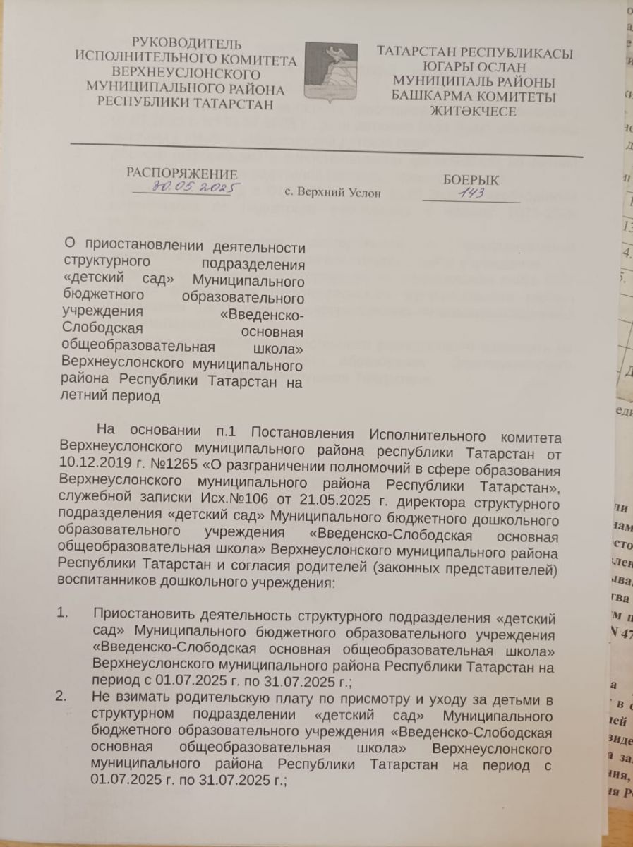 Распоряжение № 143 от 30.05.2025 О приостановлении деятельности структурного подразделения "Детский сад" МБОУ "Введенско-Слободская ООШ" Верхнеуслонского муниципального района РТ