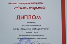 28 февраля коллектив учителей МБОУ "Введенско-Слободская ООШ" принял участие в фестивале патриотической песни "Память поколений". Педагоги исполнили песню "Россия - матушка". В номинации вокальная группа наши учителя заняли почетное второе место. Поздравляем!