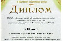 Отдел Управления образования исполнительного комитета муниципального образования г. Казани по Вахитовскому и Приволжскому районам вручил МБДОУ «Детский сад №15 комбинированного вида» Вахитовского района г. Казани Диплом III степени в номинации «Лучшая дидактическая» районного этапа городского смотра-конкурса «Лучшее дидактическое пособие по обучению татарскому языку» (воспитатель Несмелова Светлана Леонидовна)